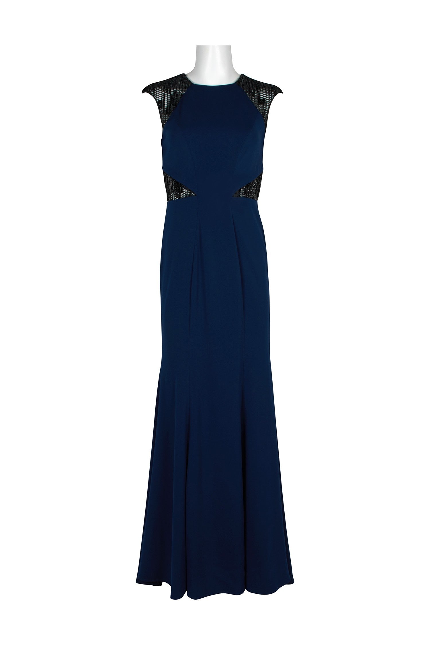 Carmen Marc Valvo Crew Neck Sleeveless Box Pleat Zipper Back Embellished Polyester Dress; Fabric: Polyester (98% Polyester, 2% Spandex) Combo (100% Polyester) Lining (100% Polyester); Fabric Content: LINED